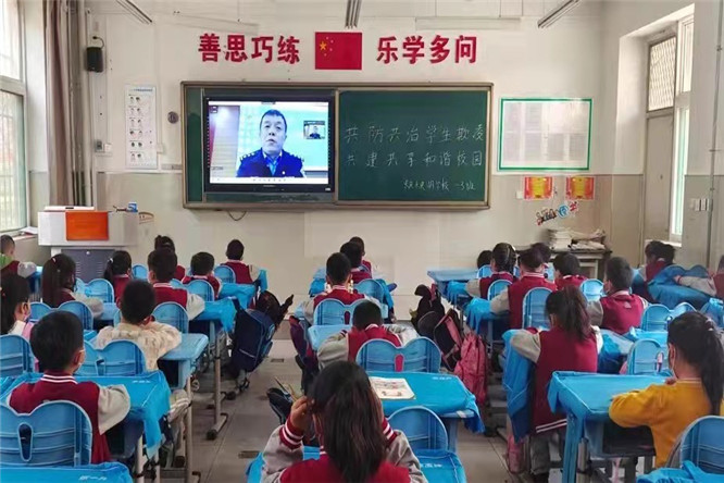 图为法制副校长刘金周副所长利用腾讯会议视频对全体学生同步开展法制教育