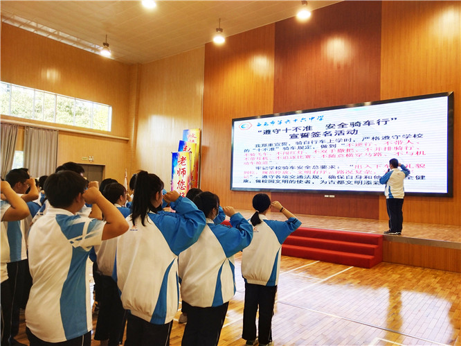 为进一步提高我校新生的骑行安全意识,自觉遵守交通规则,做到文明骑车、安全上下学。西安市第六十六中学于2020年9月15日下午在学生活动中心举行了“遵守十不准,安全骑车行”宣誓签名活动。