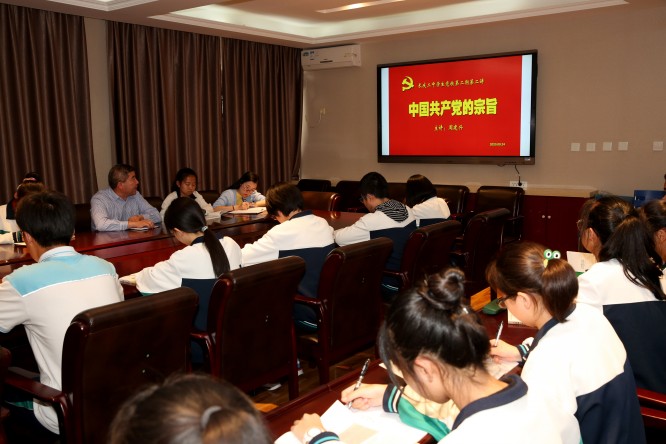 周建兴首先从“宗旨”两字的汉语意思讲起,再讲到中国共产党的宗旨是全心全意为人民服务;接着他又从党的宗旨表达语的演变,归纳总结说不论党的宗旨具体怎么个提法,其核心都是实现好、维护好、发展好最广大人民群众的根本利益;他把本次党课的讲解重点放在了为什么党的宗旨是全心全意为人民服务上。他从近代中国社会的国情、社会各主要阶级力量挽救民族危亡的行动、民族民主革命的形势讲起,深入浅出,娓娓道来,把中国共产党的诞生与近代中华民族的屈辱史和抗争史结合起来,使同学们对中国共产党的宗旨有了更加深刻的理解。他强调作为一名积极要求入党的中学生,必须牢记党的发展历程、宗旨和指导思想,希望每一位中学生都树立正确的人生观,不断提高自身思想觉悟,切实把党的宗旨落实到学习和生活中来。在学习上,树立目标,踏实勤奋,虚心求教,努力进步;在生活中,勤俭节约,不铺张浪费,遵守社会公德和公共秩序,遵守法律法规、校纪班规,关心团结同学,力所能及的帮助需要帮助的人,用自己的光和热去温暖社会,服务他人,用实际行动践行为人民服务的思想。
