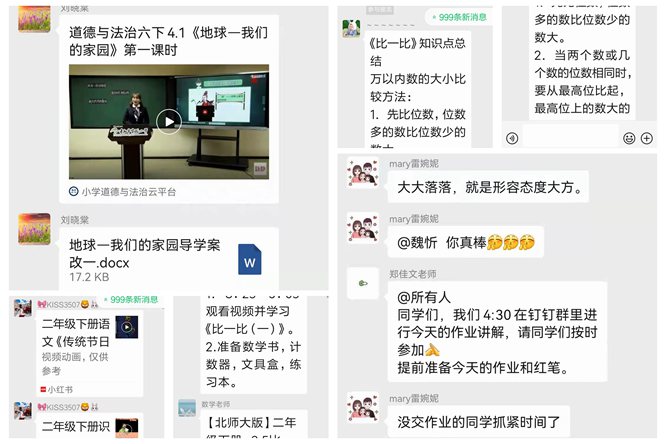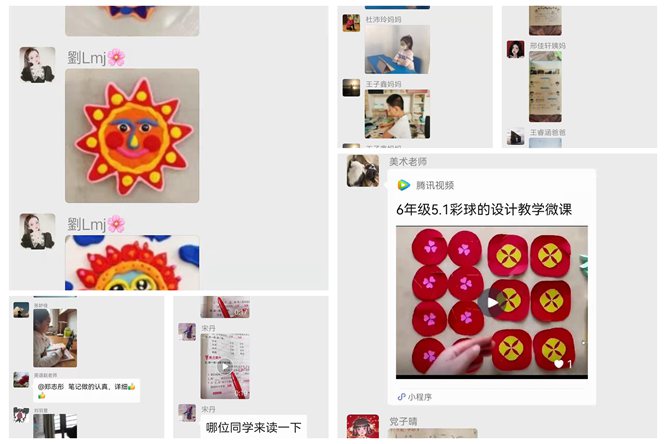“线上”教学采用“点播+线上答疑”的形式,学生自主点播教学视频,教师根据学生学习情况进行线上答疑解惑,对学困生采用打电话、发视频等方式一对一地鼓励、指导孩子学习。教务处、教研室要求各任课教师在课前熟悉线上教学的内容,综合其他线上学习资源,提前准备好教学视频,按时发放到班级微信群,帮助孩子们预习、课中学习和课后巩固。学习中,任课教师和孩子们互动,在线答疑,指导练习,批改作业,认真收集学习活动图片,及时总结、反馈,力争做到:停学不停课,家校学习一个样。