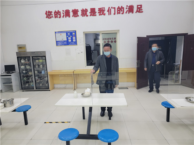 图为检查食堂隔离板安装到位情况