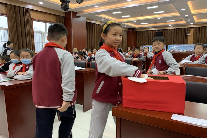 主持人向少先队员代表们介绍了学校少工委委员候选人李晨元老师,少先队代表们为李晨元老师投出自己神圣的一票,投票箱前孩子们脸上的笑容不仅是对学校少先队工作的肯定,更是显现出自己是少先队主人的归属感,大家齐心协力建设好自己的组织的光荣感。