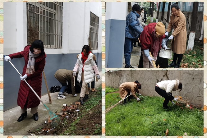 图为校长沈素青带领女党员教师清理落叶、垃圾