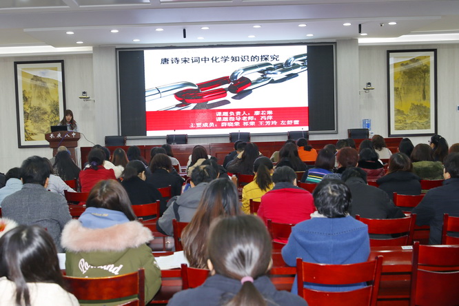 接着,学校青年教师、省级教学能手廖若琳代表《唐诗宋词中化学知识的探究》课题组全面汇报了课题研究的过程及形成的成果。