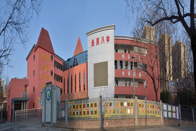 长庆八中建校于1998年9月,学校占地17亩,建筑总面积12100平方米。位于西安市凤城四路长庆兴隆园小区内,原是长庆油田一所子弟学校。2004年,学校移交政府,隶属于陕西石油普通教育管理移交中心(为陕西省教育厅直属事业单位),是一所九年一贯制学校。学校先后获得了全国教育系统先进集体、全国红旗大队、陕西省平安校园、陕西省文明校园、陕西省实施素质教育优秀学校、西安市体育传统项目学校等80多项荣誉。走进长庆八中的校园,跳动着鲜红和淡绿的教学楼活泼而典雅,宽阔的操场洋溢着一种青春昂扬的气息。教学楼里,每一面墙壁都散发着浓浓的文化气息和丰富的教育内容。十二生肖、二十四节气、中华古诗词等传统文化沁人心脾,核心素养发展要素、科技成果展示跃然醒目。“我们对校园景观、楼宇文化进行了科学规划和精心设计,使得校园的一草一木、一字一画都具有一定的教育意义。”李永奇表示,从2017年开始,学校用三年时间全面深化校园文化,把学校的教育内容和学生的成长环境紧密结合,营造出处处育人的浓厚氛围。