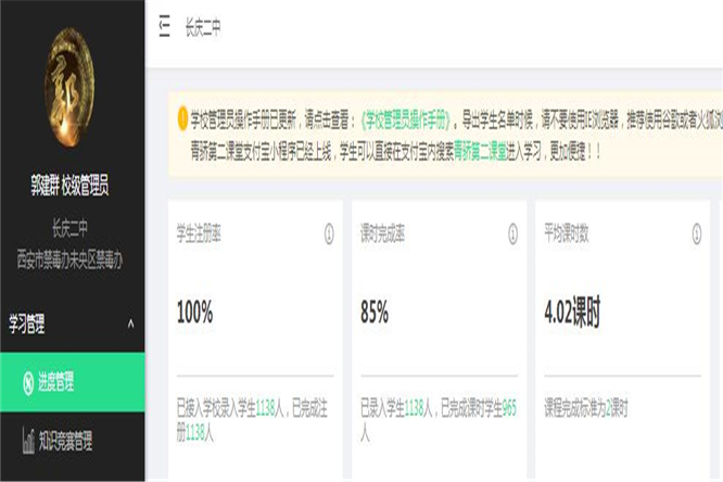 其次,该校德育处积极组织指导全校学生登录注册“全国青少年毒品预防教育数字化平台一一青骄第二课堂”,创新开展“互联网+禁毒教育”学习模式,向全校青少年提供科学系统的毒品预防教育知识。截至目前,该校30个班、1300多名学生在“青骄第二课堂”学习平台登录注册,进行线上学习,确保了“青骄第二课堂”学生注册率达到95%以上,并完成了两个课时的学习任务。此次“青骄第二课堂”学习有效促进了该校青少年毒品预防教育工作向一体化、规范化、科学化发展。