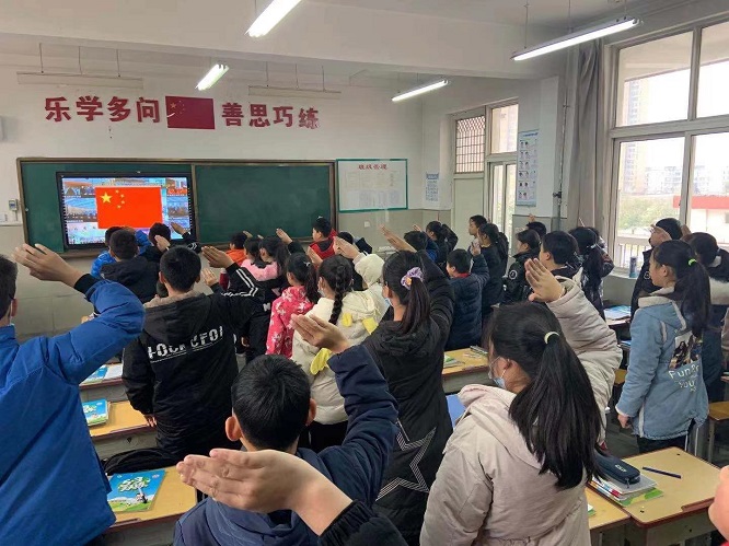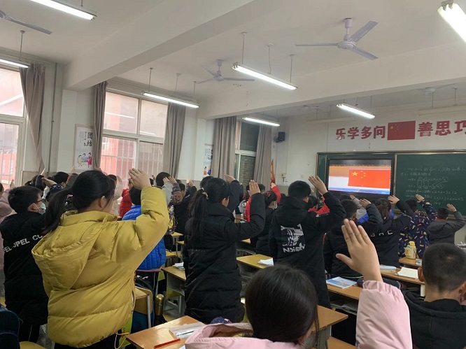 此次“宪法晨读”活动由各班班主任组织本班学生同步收看教育部全国青少年普法网直播。伴随着嘹亮、雄壮的国歌旋律,全校师生高唱国歌。各班同步领读、学生朗读,熟读宪法,在聆听中增强认知观念,在朗读中感悟宪法的重要性。