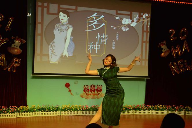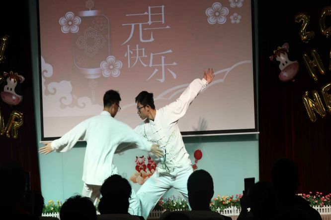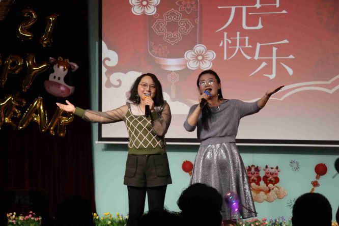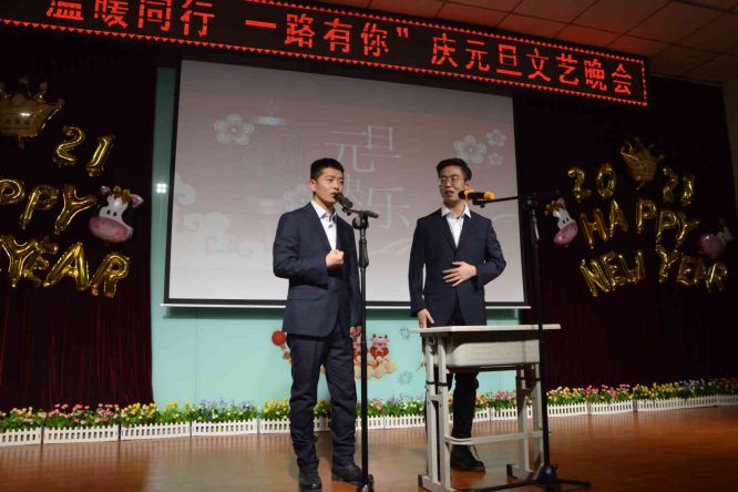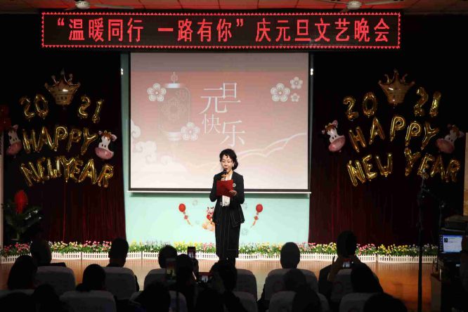 晚上6:30分的会场灯光炫烂,布置喜庆,洋溢的热情融化了寒冬的冰霜。4位主持人闪亮登场,满面春风,为全场教职工送来热情的问候。随后在校长张焱红的新年祝词中晚会拉开了帷幕,她深情回顾过去一年大家并肩作战抗击疫情,团结一心共度难关,全心全力再创佳绩的历程,感谢子校人爱校如家的无私奉献并期待新的一年继续追梦圆梦,共续发展新篇。