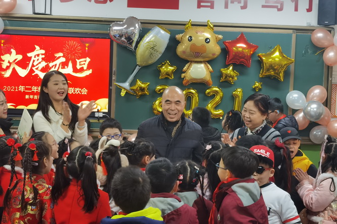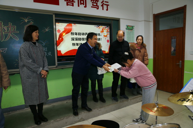 学校领导和中层干部在活动期间分两组向47个班级全体同学表达节日的问候和祝福。李永奇校长一组进入初中各班,王华书记一组进入小学各班,他们深入到各班级中,与广大师生共同联欢,并向同学们赠送了学校版画社团自主设计制作的以生肖“牛贺新春”为主题的明信片,希望师生们新的一年勤恳如牛、强壮如牛,“牛转乾坤”、“牛运亨通”、“牛气冲天”。