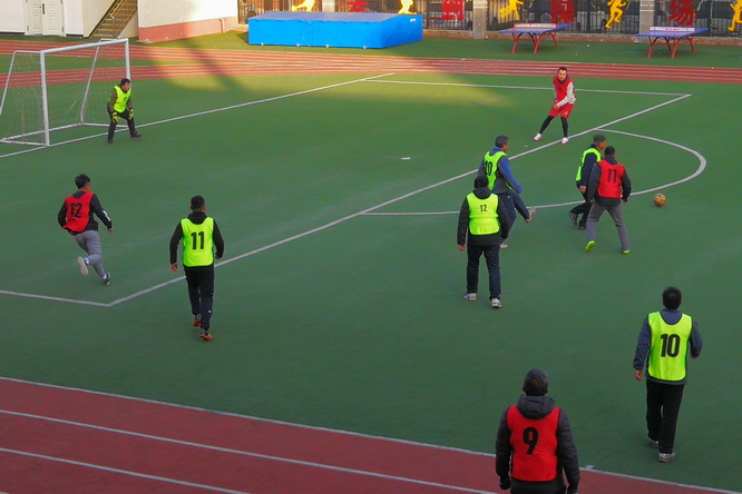 图为在学生联欢的同时,学校工会组织了教工足球赛