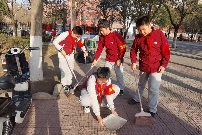 (2)走出校园,踏上社会,3月3日下午,学校组织六年级、七年级学生到学校广场上进行了卫生清扫志愿活动。志愿者们满腔热情、微笑服务,运动器械经他们的擦拭变得焕然一新,花坛草地经他们的捡拾变得绿意盎然,围栏地面经他们的清扫变得一尘不染。行人们纷纷竖起了拇指,为他们点赞。