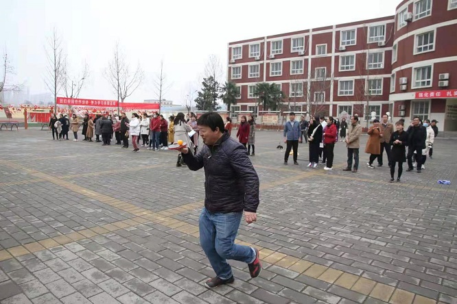 表彰大会结束后,职工文体活动正式开始。首先是职工集体热身操表演,在“学习雷锋好榜样”的音乐声中,大家跟随台上的几名领队人员做起了团体健身操;紧接着,以年级组部门为单位,进行了“团队向前冲,快乐健康行”50米托乒乓球比赛,各团队你追我赶,奋力争先,场上气氛热烈。