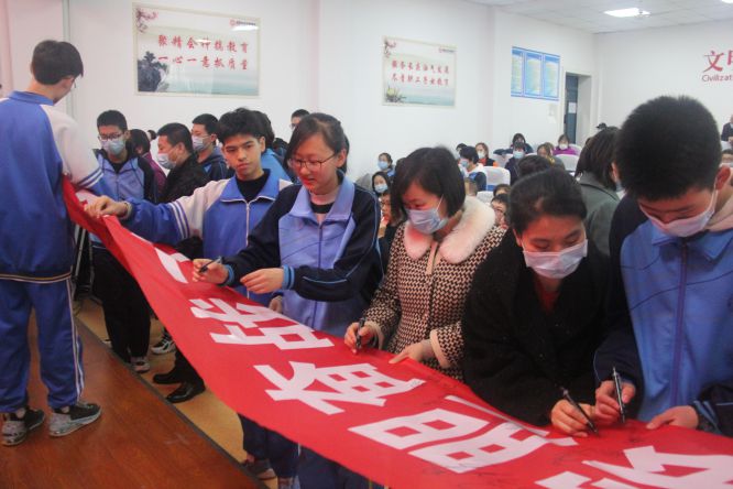 九年级全体师生、家长在横幅上签名