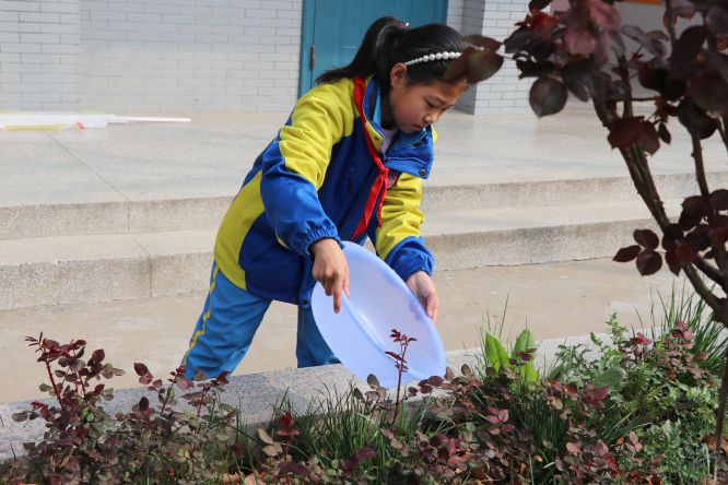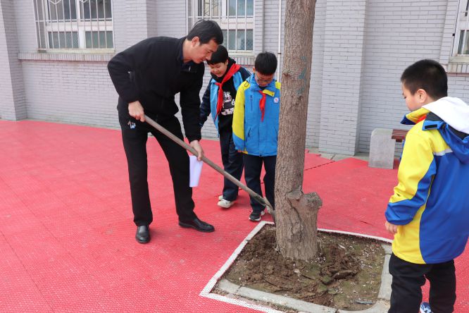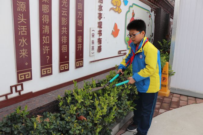 2021年3月12日上午,在德育处、少先大队、总务处的统一安排下,四年级学生兴致勃勃的对校园进行绿化美化,对校门外公路两侧的花草树木进行护理。他们拿着剪刀、锄头、水桶等劳动工具,分工协作,为校园花草树木修剪、松土、浇水,每个环节,大家都做的一丝不苟,使校园内的树木及花卉给人以生机勃勃的感觉,成为春天又一道美丽的风景。