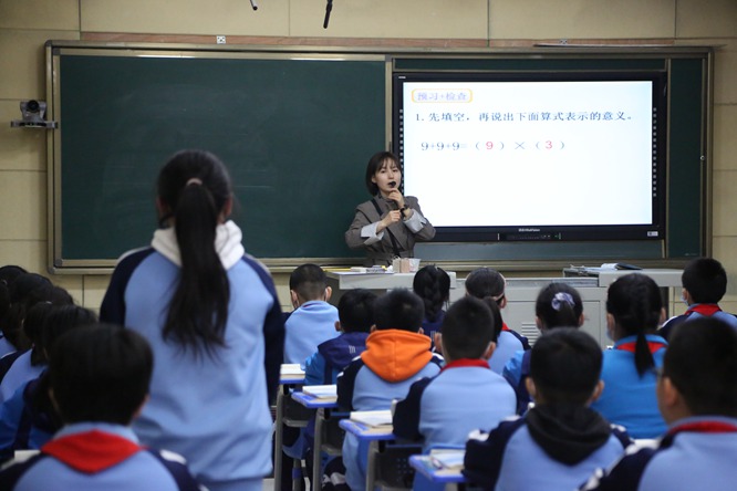 为促进长庆泾渭小学教师教学方法与学生学习方式的转变,将“4+4课堂教学模式”落实到课堂,充分发挥教学能手和教坛新秀等优秀教师的引领与指导作用,全面提升我校教师教育教学水平,学校在本学期继续进行“名师课堂开放日”活动。2021年3月17日上午第三节课,校级教学能手李梅老师利用“4+4课堂教学模式”,在录课室进行了《分数乘法(一)》的引领课展示活动。校长许正宁、主管教学工作的副校长杨军英、教务主任段静峰和全校35名教师参加听课活动。
