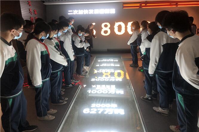接着,全体师生在展馆讲解员老师的带领下,逐一进行参观、感悟。长庆油田展览馆布展面积约为4500平方米,共分为“创业厅、发展厅、文化厅、未来厅”四个方面十个部分,馆内展出近千幅历史图片、40多件实物、数百个视频窗口,体验式触摸操控系统、发光地图、大型弧幕影厅等现代声光电高科技融入了多项展示环节,立体呈现出一幅长庆油田五十年风雨光辉历程的动态画卷。这里有钻井工人风雨无阻战天斗地的豪迈英姿,这里有采油采气工人日夜守望一丝不苟的动人脚步,有科技人员技术攻关的感人身影,也有两代长庆石油人的光辉形象,这里有长庆人“跑步上陇东”的英雄气概,这里也有长庆地址勘探队员们翻山越岭找油气的坚毅身躯。展览馆以感人的情景、翔实的史料记载、高科技的展示形式震撼着每位参观者的视觉和听觉神经,展示了长庆油田50年“磨刀石上闹革命,低渗透中铸丰碑”的风雨历程和取得的成就。