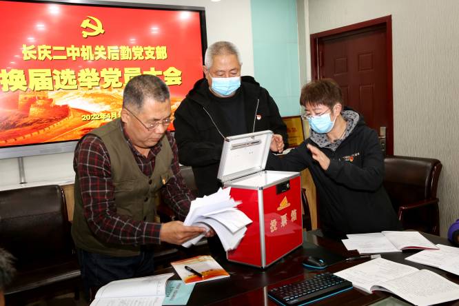 其次,该党支部组织委员程永干同志组织全体党员学习了《长庆二中机关后勤党支部换届选举办法》。随后,举手表决通过了检票人、计票人,党员以无记名差额投票选举产生了新一届支委会委员,向社锋、程永干、姚红欧同志当选。