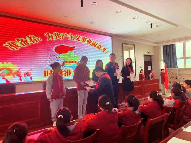 图为杨红斌为新一届少工委委员颁发聘书