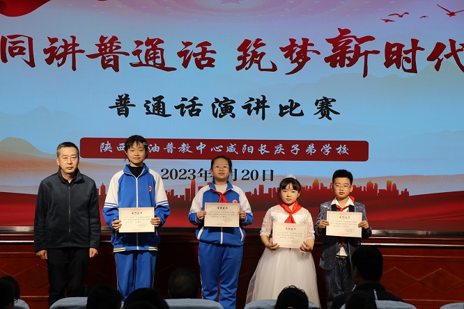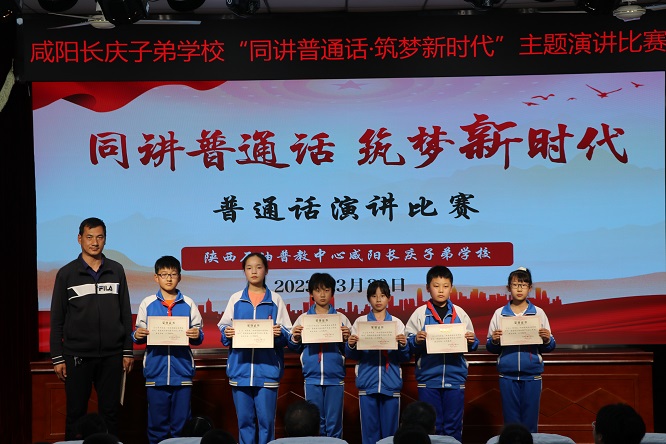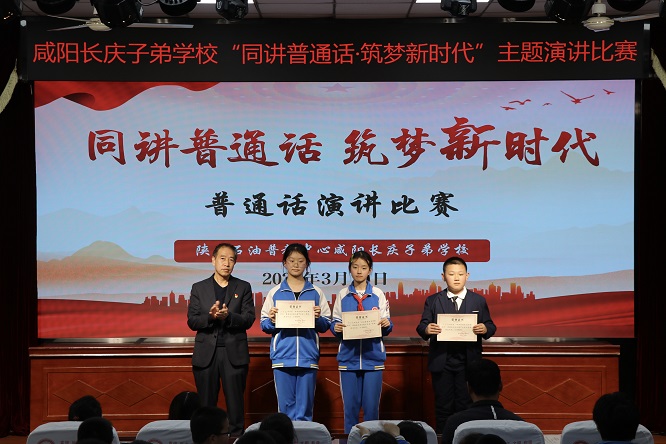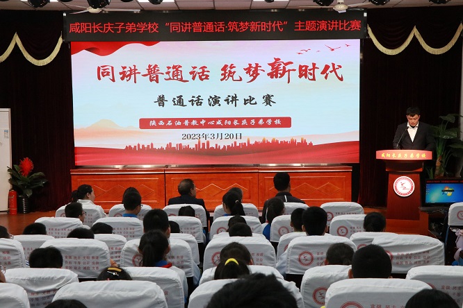 为加大国家通用语言文字的推广力度,传承中华优秀语言文化,提升广大青少年的语言文字应用能力和语言文化素养。3月20日下午,咸阳长庆子弟学校在阶梯教室开展了“同讲普通话 筑梦新时代”主题演讲比赛活动。党总支书记田宁苏、教务主任隋弢、德育主任翟新峰、团总支书记郭小翠、综合办干事李茜老师担任评委。比赛由德育处干事王伟老师主持。