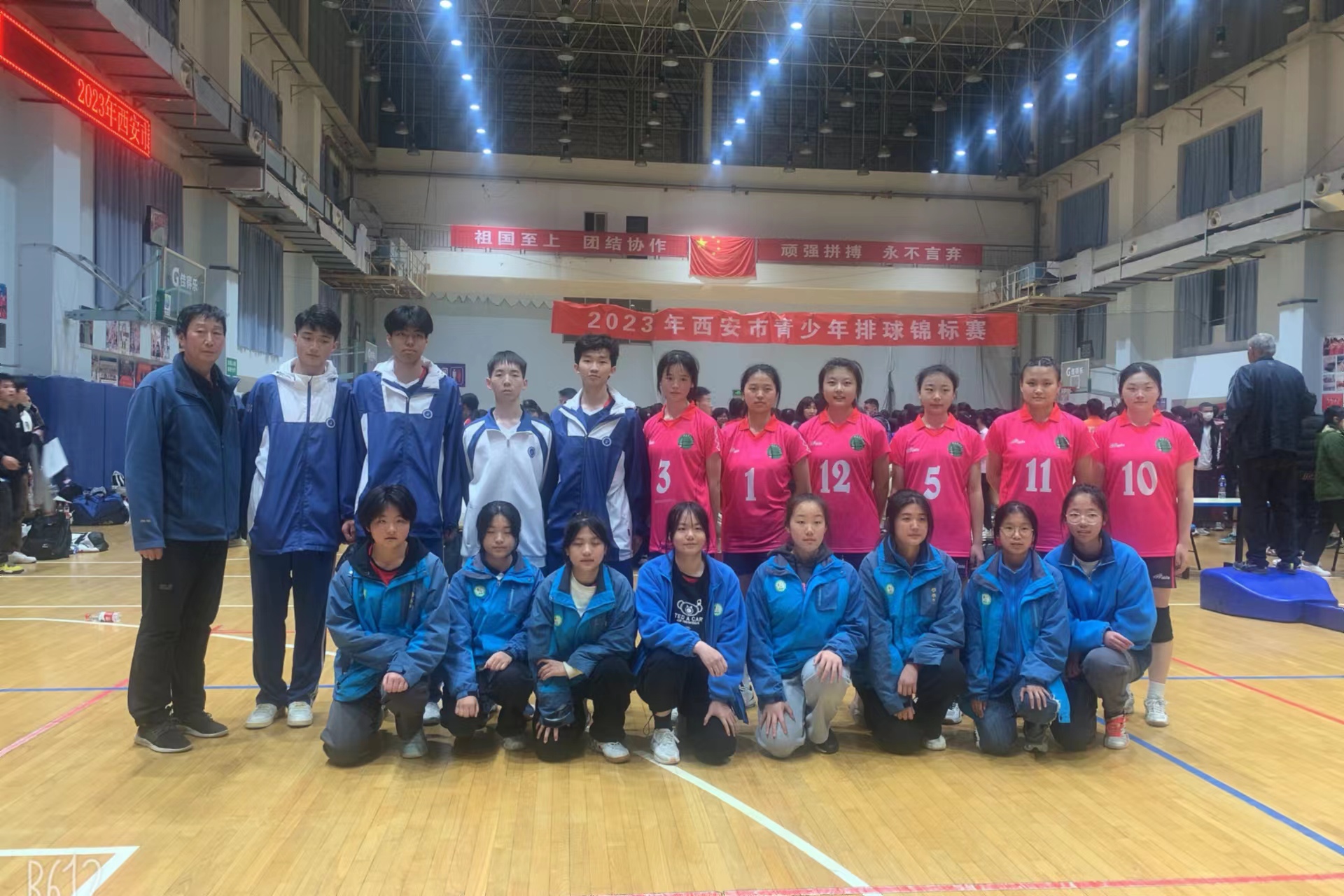 图为泾河学校女子排球队教练员岳邦宝(右)王凯(中)与全体队员赛场合影