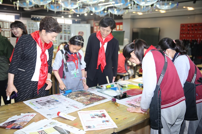 表彰暨文艺展演结束后,参加庆祝活动的领导来宾在学校领导陪同下饶有兴趣的观摩了版画工作坊和学生美术作品展。