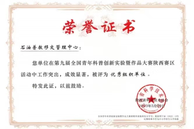 近日,2023年第九届全国青年科普创新实验暨作品大赛陕西赛区复赛圆满收官。石油普教中心13支代表队经过现场制作、作品展示、专家问辩、公示等环节在比赛中喜获多个佳绩。中心获优秀组织奖,中心本届活动负责人郑甜获优秀组织工作者。各校参赛师生在比赛中展现出卓越的水平,取得了良好成绩。