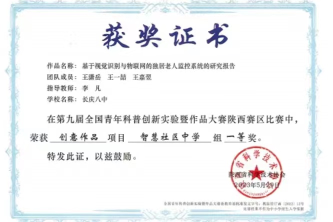 在智慧社区中学组的比赛中,长庆八中七年级学生王潇岳、王一喆、王嘉翌三名同学的参赛作品《基于视觉识别与物联网的独居老人监控系统的研究报告》获得全省一等奖,并推荐参加全国总决赛。西安市第六十六中学教师任绥海、冯淑娟两位老师指导的《挽救“灯下黑” 乡间道路太阳能照明对农作物破坏性影响研究与补救》作品荣获全省三等奖。在未来太空车中学组的比赛中中心各校分别荣获二等奖4个,3等奖3个,优秀奖4个的好成绩。