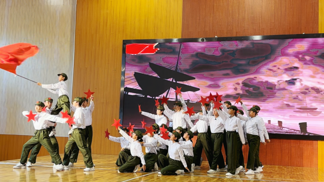 参赛作品从素材创编、人员挑选、指导排练到服装选取历时近1个月完成。同学们不辞辛苦,以最饱满的热情参与排练;老师们利用晨读、课后服务时间精心指导、高效训练。最终,在指导老师和33名同学的共同努力下,参赛作品《跨越百年的承诺》呈现出最完美的舞台效果。