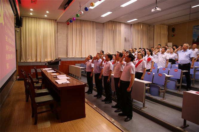 周建兴宣布长庆二中庆“七一”表彰暨学习活动开始,全体党员起立,高唱《国歌》。党总支委员郭建群带领全体党员面对鲜红的党旗举起右拳,庄严宣誓、重温入党誓词,进一步增强广大党员的责任感和使命感。