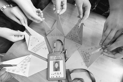 桑枣中学初三(8)班的几位同学用鲜艳的彩纸,折叠了千纸鹤,写上自己的心里话。孩子们用这种朴素的方式,表达他们对叶志平校长的怀念。
