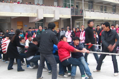 随着冬季的到来,天气逐渐变冷,户外活动的人们都穿上了厚厚的外衣,给人们的活动带来不便,同学们的户外活动逐渐减少,室内外气温的反差极容易感冒。为了丰富冬季校园文化生活,12月13日14日下午,礼泉子校举行了一年一度的全校师生拔河比赛,比赛分小学低段,小学高段,初中段和教师组四部分进行,比赛采用三局两胜制,各班组织了加油拉拉队,设计了加油口号,观战的同学们有秩序的分列场地外围,在同学们的呐喊声和加油声中,经过激烈的角逐,小学低段第一名三年级2班,小学高段第一名是六年级2班,初中段第一名是七年级2班。得胜者欢呼雀跃。有喜则有忧,没有取得名次的班级学生落下了伤心的眼泪。欢呼跳跃和伤心落泪都反映出了同学们心存各自的班集体,有着强烈的集体荣誉感。本次活动在丰富校园文化生活的同时,从一个侧面反映出了我校的德育教育和班级文化建设的良好发展,表现出了积极向上的心态和凝聚力。