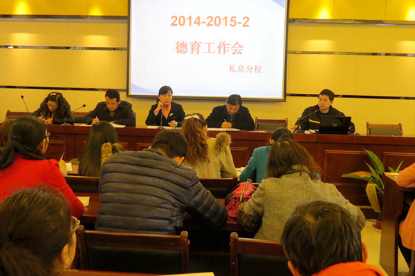 2015年3月18日下午,礼泉分校按工作计划如期召开了新学期第一次德育工作会议,参加会议的人员由全体行政人员和班主任组成。本次会议紧扣培育与实践社会主义核心价值观这一主线,并结合学校的实际情况,确定了本学期德育工作重点内容和德育运行大表。