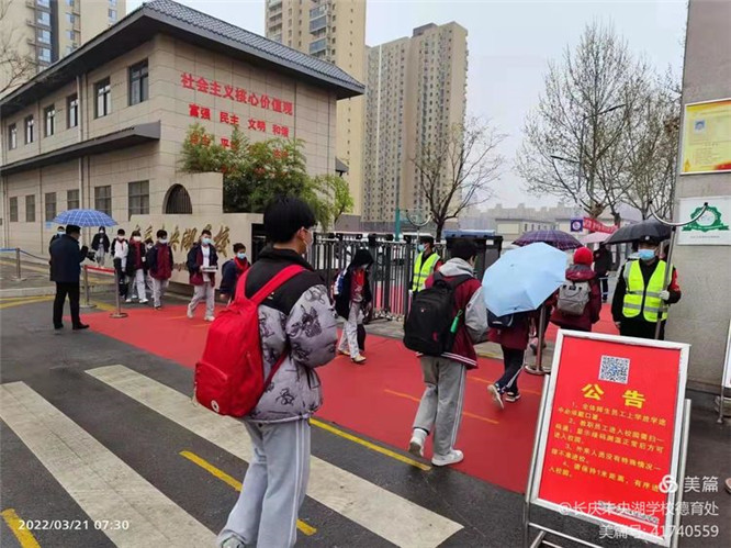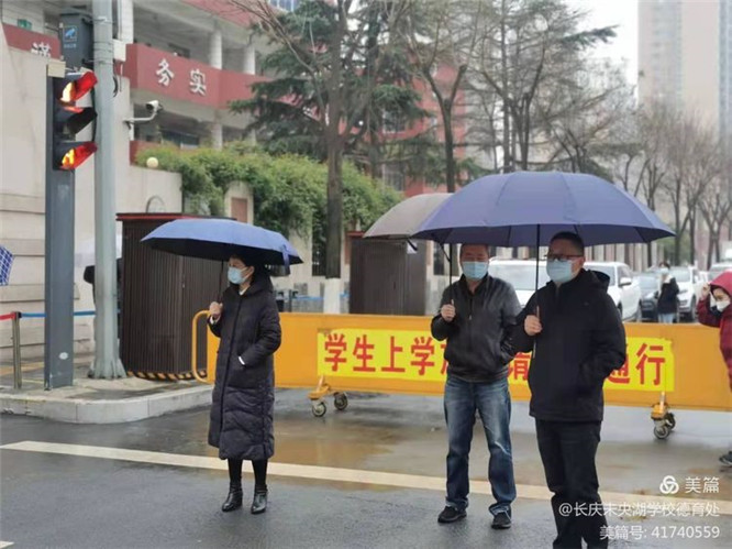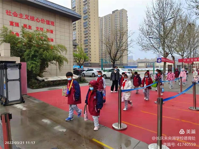 晨光微雨,长庆未央湖学校的值班教师、安保人员已等候在校门口,期盼着一张张久违的笑脸。