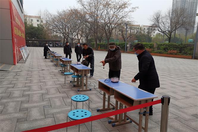 3月22日早晨,学校领导和老师们早早到位,搬桌凳,摆放设备,为学校全员核酸检测做准备工作。