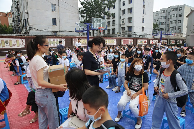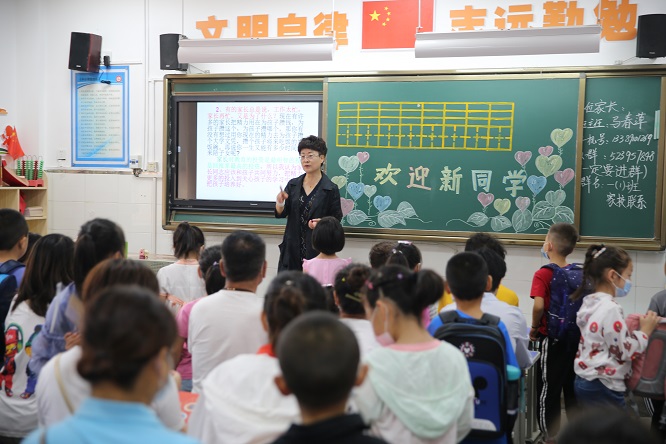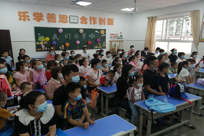 一年级的小朋友在爸爸妈妈的带领下,早早的就来到学校,测温、消毒之后,副校长郭国良主持召开了“许下心愿、幸福成长”一年级新生入学仪式。