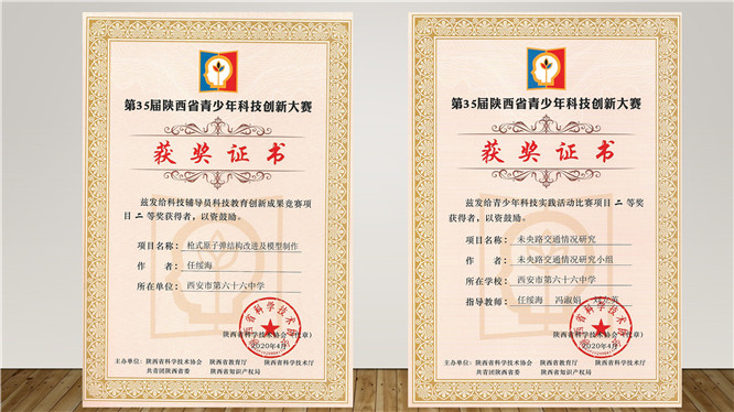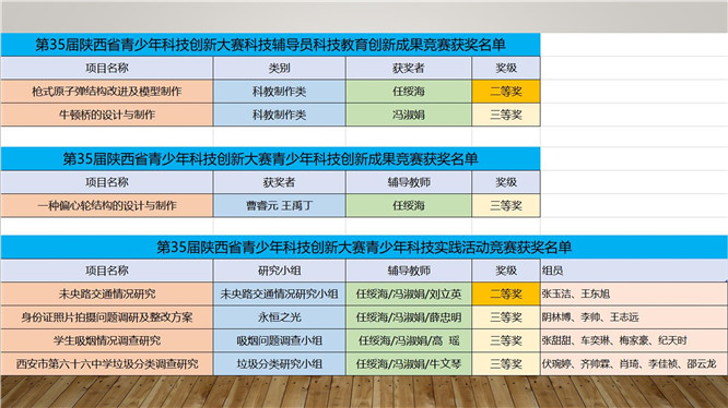 在入围陕西省第35届青少年科技创新大赛七个作品中,获得省级二等奖两项,三等奖五项。继上届我校两名教师分获科技创新教育成果竞赛一等奖、二等奖之后,辅导教师任绥海、冯淑娟又分别获得本届大赛省级二等奖、三等奖。