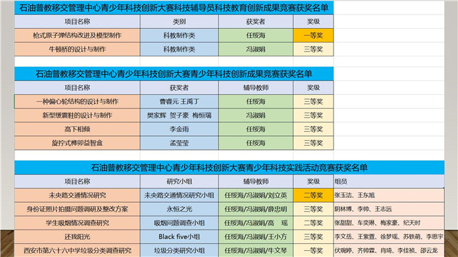 此次活动中,共有11个作品上报石油普教管理移交中心(市区级)进行初选,其中获得一等奖2项,二等奖2项,三等奖七项。