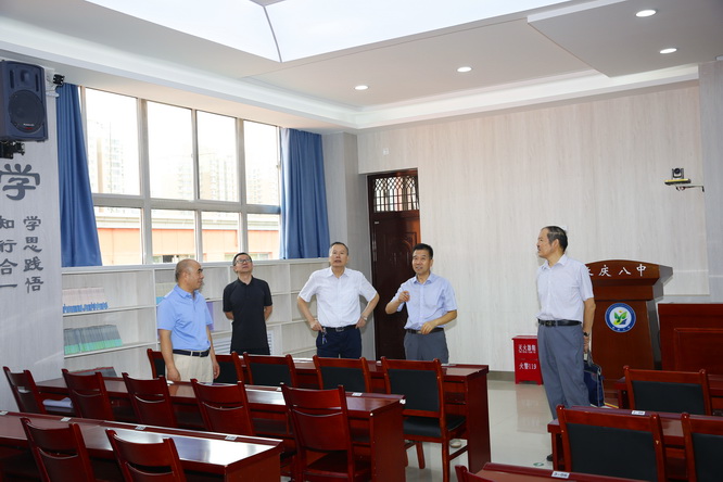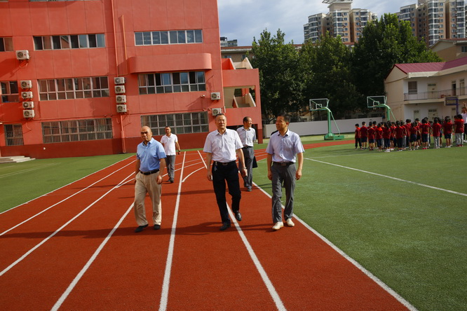 王智兴一行在学校领导陪同下深入查看了学校操场草坪维修保养、四楼会议室开放式学生阅览室和主教学楼三楼学生卫生间改造等暑假校建维修改造项目。