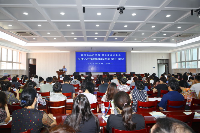 图为校长李永奇传达中心2020年中小学教学质量分析会精神,组织学习《长庆八中五年发展规划》和《长庆八中“四五六”一体化德育体系实施教程》,并对全体教职工作新学年工作要求