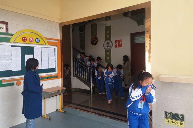 图为消防演练中学生有序撤离