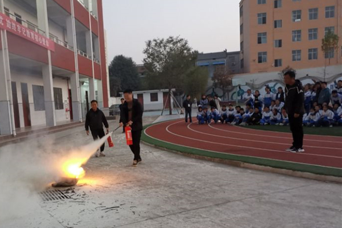 随后全体责任人及初中部学生进行了遇火处置及灭火器使用培训,安保主任纪海龙对全体学生就火情火险处置办法、灭火器的分类、使用等进行了培训,并组织学校微型消防站及功能部室负责人和九年级安全员进行了现场灭火的培训,培训人员两两一组,表现十分勇敢,迅速将熊熊的大火扑灭。