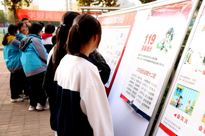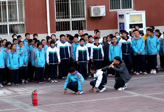此项活动分三个环节完成。第一环节:消防知识宣传。针对冬季火灾特点,为普及消防安全常识,增强师生安全意识,该校在办公楼前举办了为期一周的消防知识展板宣传活动,宣传内容分为“消防安全三提示”、“消防安全常识二十条”、“防火10法”、“火灾逃生自救十二招”、“灭火器使用方法”五大板块,供师生阅读学习。