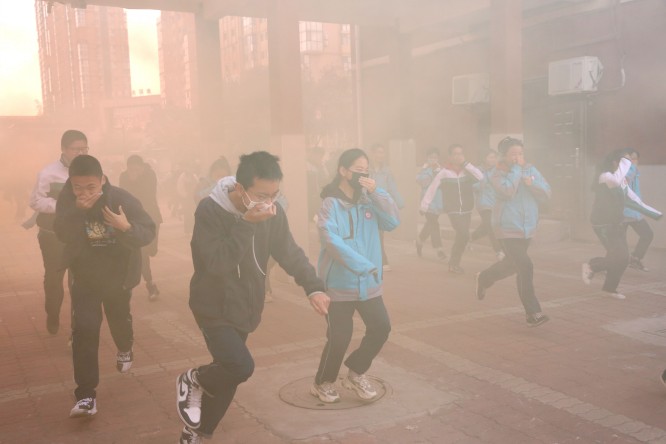 图为学生火灾逃生演练