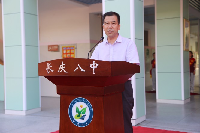 他首先对270多名新同学和13名新老师表示热烈欢迎,欢迎他们加入八中大家庭;对将要受到表彰的236名优秀学生和13个先进班集体表示热烈祝贺!他强调对全体学生来说,今天是他们成长历程中一个全新的起点;对全体老师来说,又是一段辉煌事业的开始;对学校来说,它所引领的,必将是长庆八中灿烂的每一天!