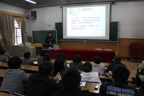 对此次活动学校高度重视,特设立由校长张吉高为组长的领导小组。及早通知,给年轻教师以充分的准备时间。19名青年教师全员参与,所有教师观摩。比赛中所有的年轻教师都能熟练运用多媒体进行说课,环节齐全。