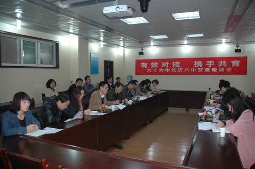 为做好初高中学生的教育衔接,实现学生的平稳过渡,互通信息,携手共育,更有针对性、更有效地做好学生的教育培养工作,2011年10月22日,六十六中邀请长庆八中领导和部分教师在六十六中召开了“有效对接,携手共育”交流座谈会。座谈会由六十六中副校长王金江主持。
