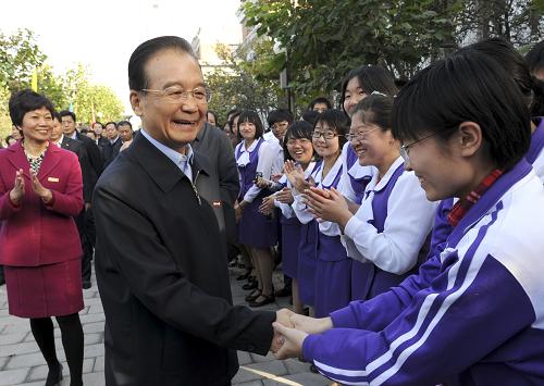 10月25日,中共中央政治局常委、国务院总理温家宝在天津调研时,回到母校南开中学,与师生交流。新华社记者马占成 摄