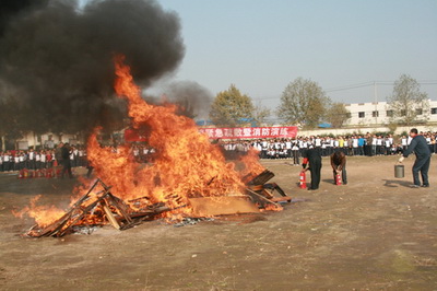 随后,在火灾模拟现场,校保卫处对全体师生进行了即时消防培训,面对熊熊烈火、滚滚浓烟,老师们按照演练方案各司其职,有的带领学生安全撤离,有的及时灭火,有的负责疏散后学生的安排,从火警开始到灭火结束仅用三分钟时间,演练活动安全高效进行。