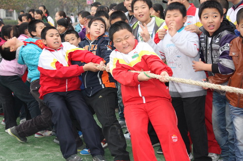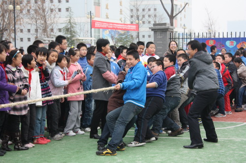 为了丰富同学们的业余文化生活,增强同学们之间的凝聚力,激发学生参与体育健身的积极性,提高终身锻练意识,长庆泾渭小学于2011年11月21至25日在教导处的安排下,各年级组和体育教研组利用大课间活动时间组织了学生拔河比赛。本次比赛大家本着友谊第一,比赛第二,重在参与的基本原则,以热情、积极的精神投入到活动中。