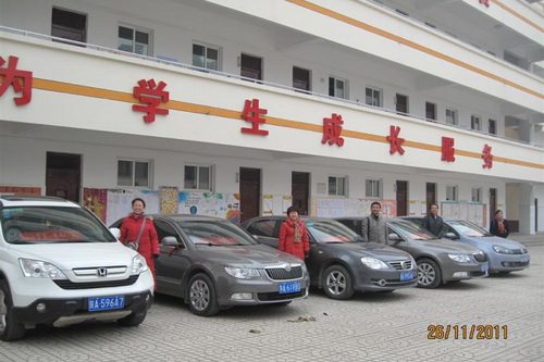 26日,满载着六十六中师生的爱心,学校领导和高二年级老师的私家轿车队向儿童村出发了。